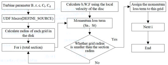 The resultant velocity of the blade element, , is based on BEM theory, and a and b are the axial and tangential flow induction factors, respectively. When coupled with CFD, in this equation can be replaced by the local velocity , and the tangential flow induction factor b can be calculated from the local velocities and , . The axial and tangential momentum loss terms of the disk region, which represent the turbine in the CFD domain, are and , respectively.