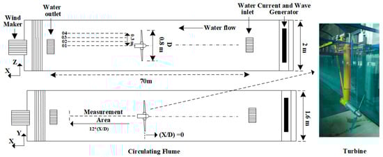 The water depth was maintained at 1.2 m, and the incoming flow was set to 0.489 m/s, and the turbine model’s rotational speed was 60 r/min. The turbine had a diameter of 0.8 m, with a geometric scale of 1:15, representing a prototype of 12 m. The experiments were conducted under Froude-number similarity, while the incident flow velocity corresponded to a real-life velocity of 2 m/s.