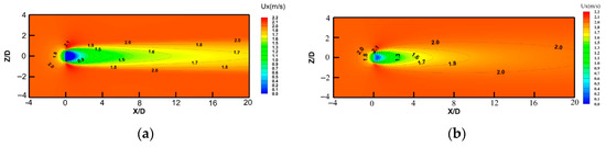 Figure 4 illustrates the velocity contours for X/D ranging from −4 to 20 and Z/D ranging from −4 to 4, for turbulence intensities (TI) of 2% and 18%. In both cases, the wake regions expand. The low-speed area for TI = 2% is larger than that for TI = 18%, indicating that the water flow in the wake with TI = 18% recovers faster than that with TI = 2%. The extent of the contour lines under the same velocity conditions initially expands and then contracts. At X/D = 20, the 2.0 m/s contour line for TI = 2% is still expanding, while the 2.0 m/s contour line for TI = 18% is already contracting. This phenomenon is discussed in detail in the following section.