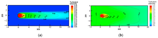 Figure 5 illustrates the TI contours for boundary conditions set at (a) 2% and (b) 18%. In Figure 5a, TI increases notably as water passes through the tidal turbine, decreasing as axial distance increases. Figure 5b demonstrates that the TI across the entire domain gradually diminishes with increasing axial distance. As water flows through the tidal turbine, TI experiences a significant increase; however, due to the higher background TI, the elevated TI induced by the wake gradually blends with it. The area exhibiting increased TI due to the wake is relatively limited, less distinct compared to the wake effects observed with a background TI of 2%.
