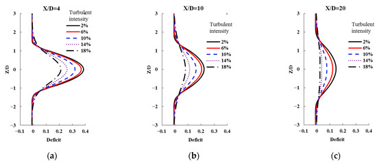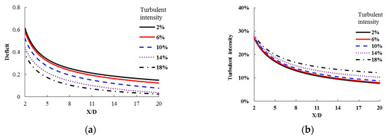 The axial results along the centerline for each case were extracted from the numerical model and are depicted in Figure 6. Figure 6a displays the velocity deficit curve, while Figure 6b shows the TI curve. The deficit coefficient decreases with increasing axial distance and turbulence intensity. The velocity deficit curves for TI = 2% and TI = 6% exhibit close proximity. At X/D = 2, the deficit ranges from 0.4–0.6, whereas at X/D = 20, it ranges from 0.15–0.02. This indicates that the turbine wake recovers more swiftly with higher TI.