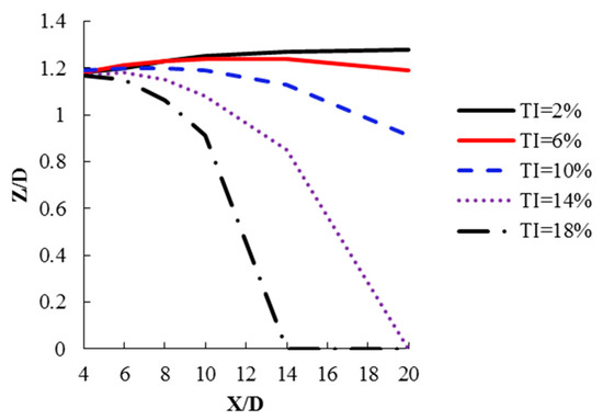 Figure 9b displays the radial curve of turbulent intensity (TI) at an axial distance of X/D = 10. The TI values at Z/D = 0 for different cases range between 12% and 15%. At higher background TI values, such as 18% or 14%, TI increases only slightly. When the background TI values are 2%, 6%, or 10%, the TI values around the centerline are similar. The heightened TI induced by the turbine gradually blends with the background TI in these cases.