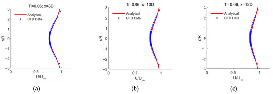 For a turbulence intensity of 0.06, the analytical wake model results are compared against the CFD data at different axial distances: (a) 6D; (b) 10D; (c) 12D.