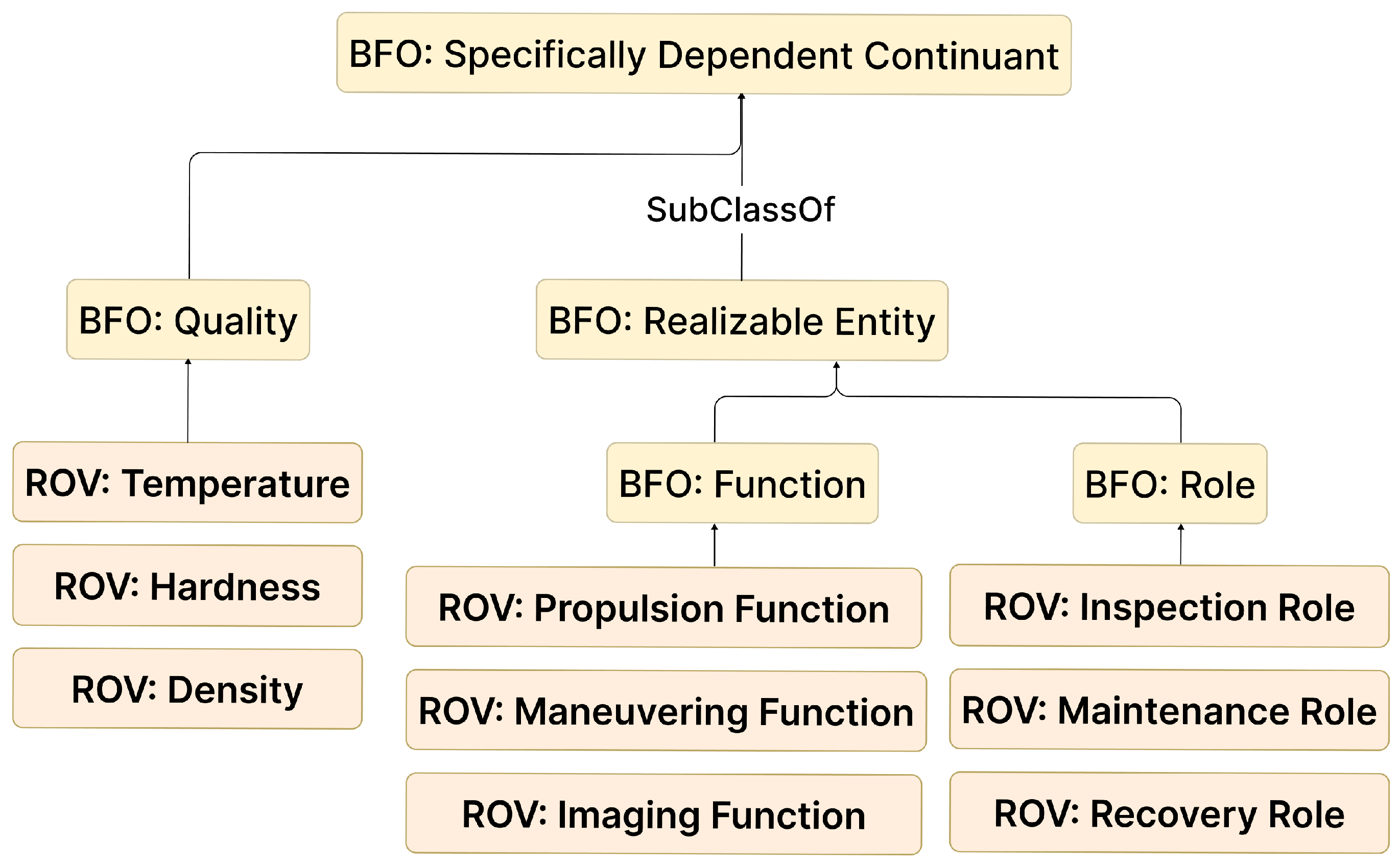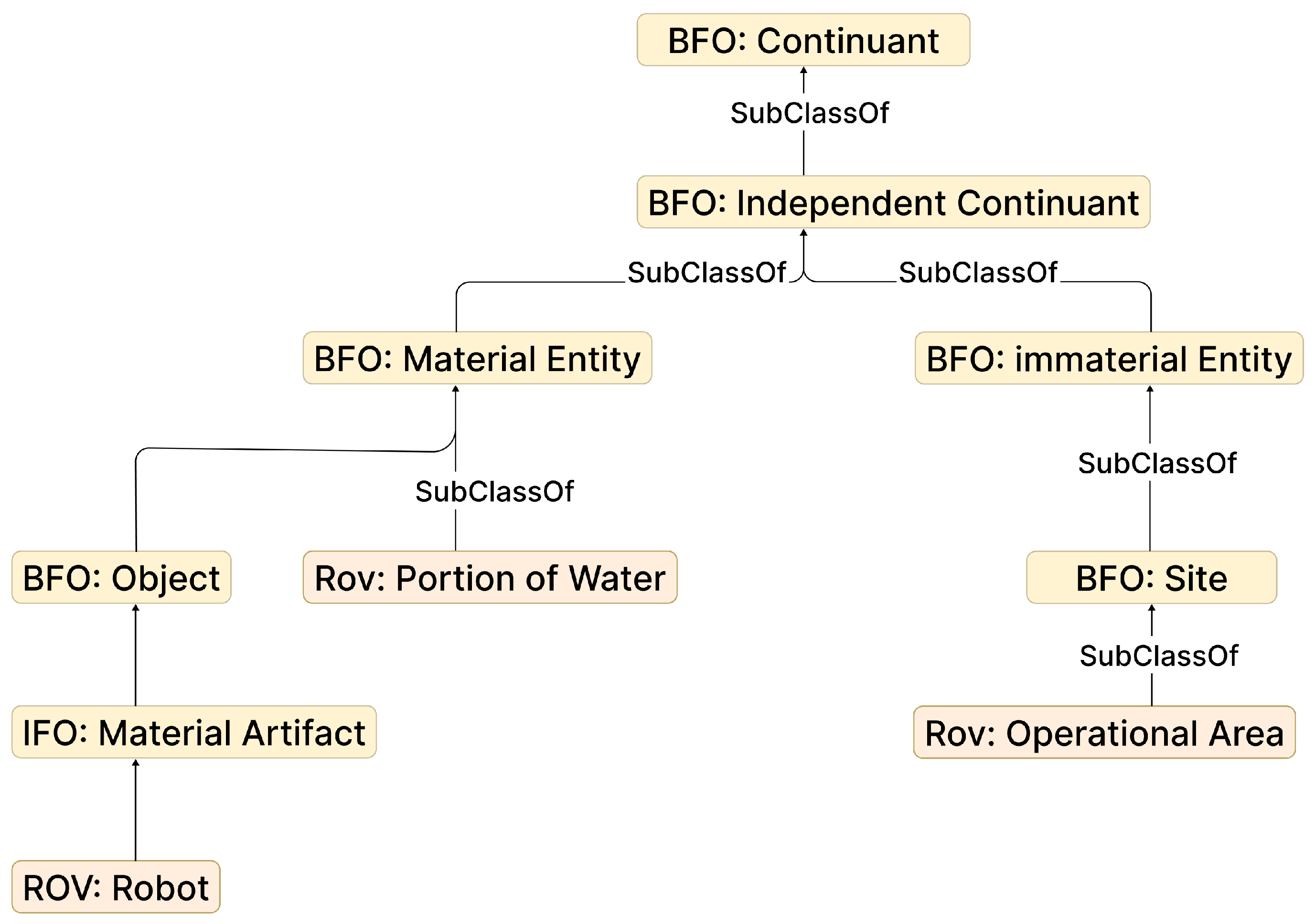 A dependent continuant is an entity that depends on other independent continuants for its existence. For example, the weight or size of an ROV are the properties (qualities) that cannot exist on their own and depend on the robot for their existence. If an entity depends on a specific continuant, then the entity is a type of