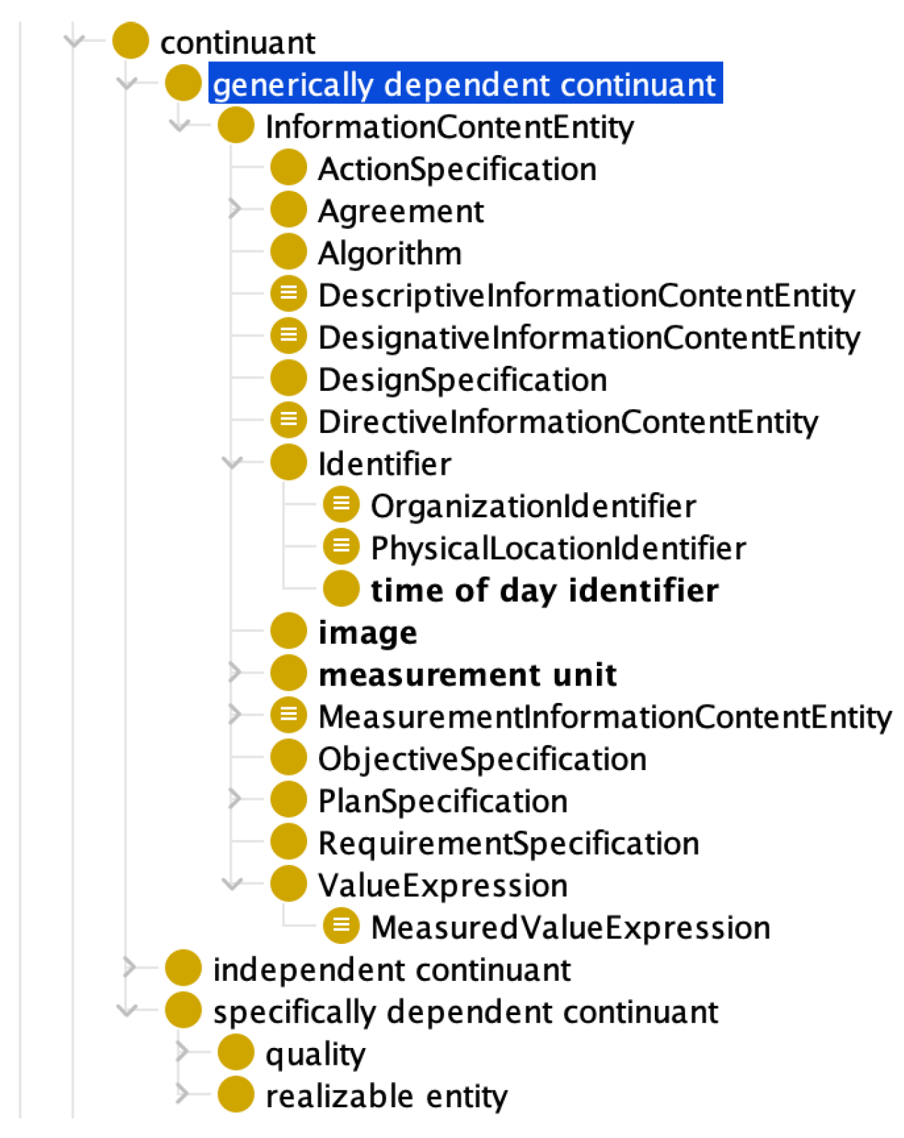 In BFO, continuants are entities that persist through time while maintaining their identity, regardless of changes in their internal states or external conditions. Continuants are essential for representing stable, enduring entities. This is in contrast to processes or events, which occur over time and persist differently. The hierarchy of the “continuant” class is shown in