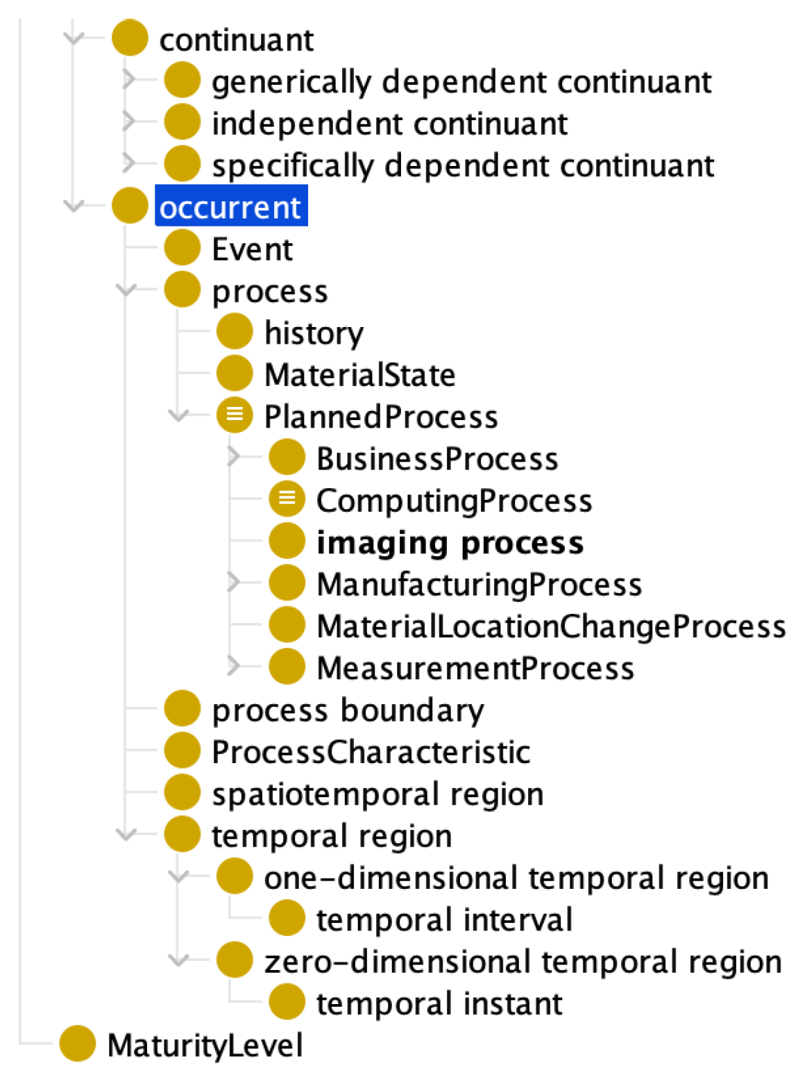 26] as their top-level ontology (TLO). BFO has been widely used in the biological domain for integrating disparate ontologies or data models and developing interoperable ontologies for biological applications. The IOF ontologies also use a common mid-level ontology named IOF Core. The IOF Core ontology consists of generic constructs and patterns that are reusable across domain-level industrial ontologies. Using a TLO in conjunction with a mid-level ontology streamlines the ontology development process through providing pre-validated design patterns and also results in designing more reusable and principle-based ontologies. BFO categorizes entities under two broad classes, namely, continuant and occurrents. The next sections discuss various ROVON constructs under these two categories.