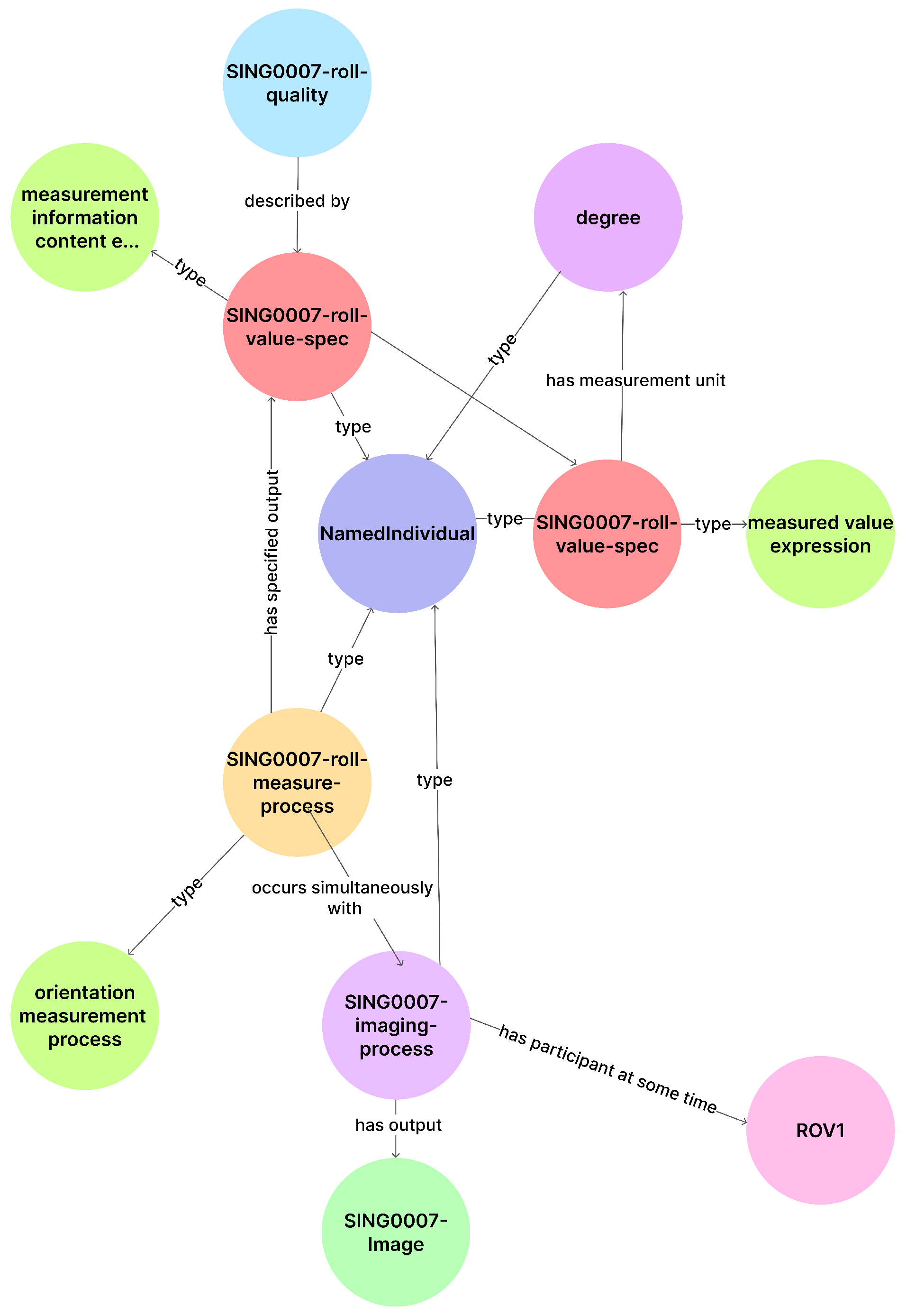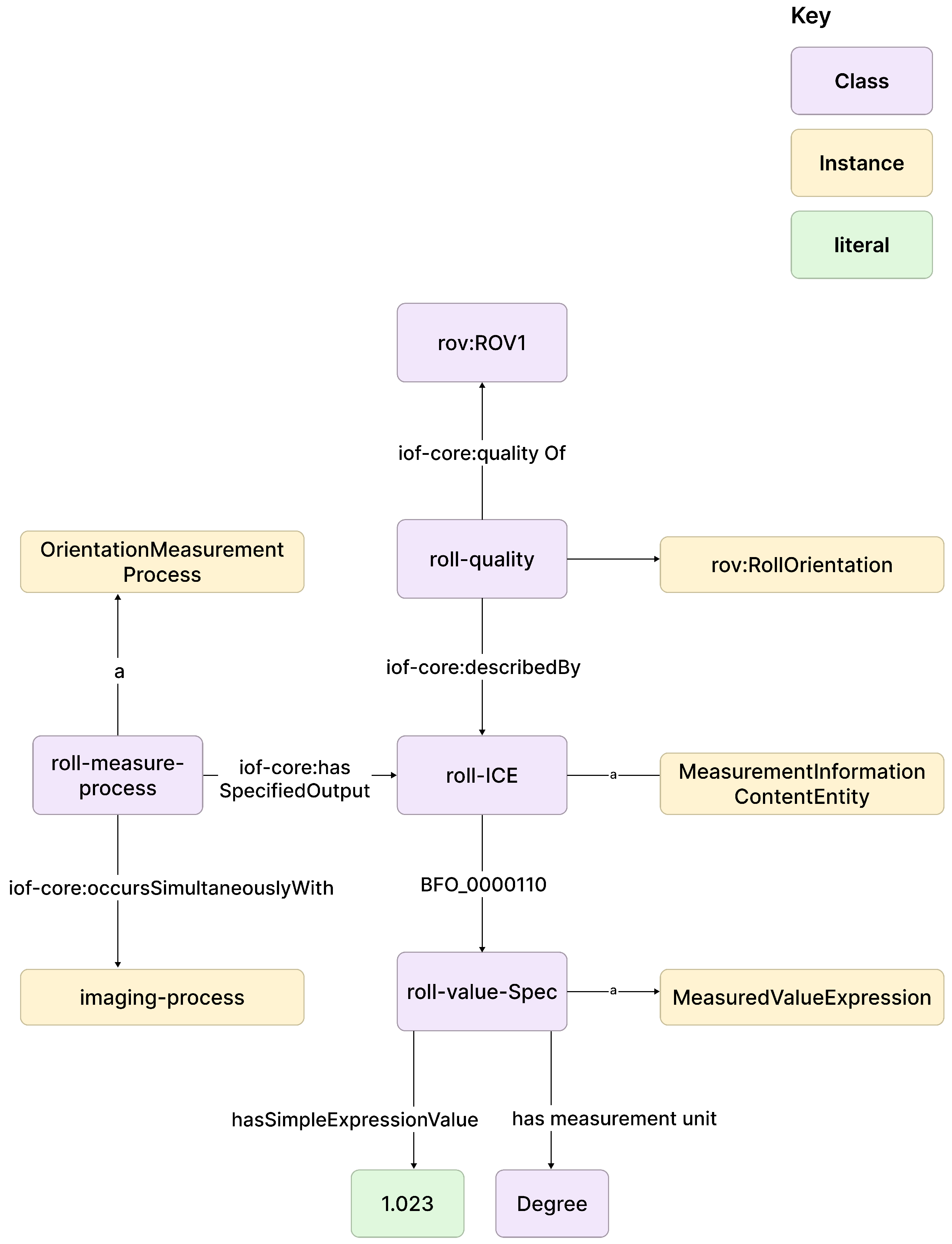 Figure 5 is a sub-class of Spatial Orientation, which is a type of Relational Quality. Other types of Spatial Orientation classes in ROVON include Pitch Orientation and Yaw Orientation. Definitions for some relevant continuants are provided in