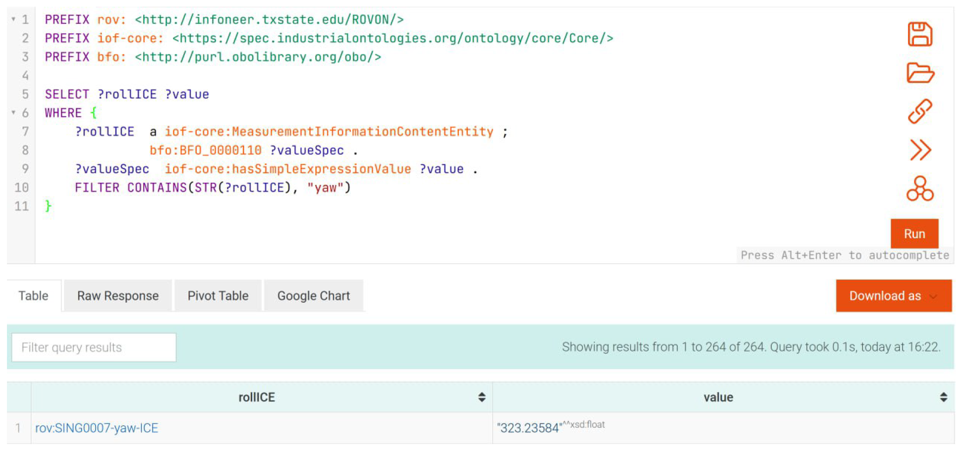 Ontology requirements are typically established at the outset of development by defining a set of Competency Questions (CQs)—the specific queries the ontology must be able to answer. Since ROVON is designed primarily for underwater pipeline inspection, its CQs are crafted to reflect the domain’s key concerns, such as detecting pipeline defects, identifying the root cause of defects, and correlating sensor readings with pipeline features. Below are some example CQs for ROVON: