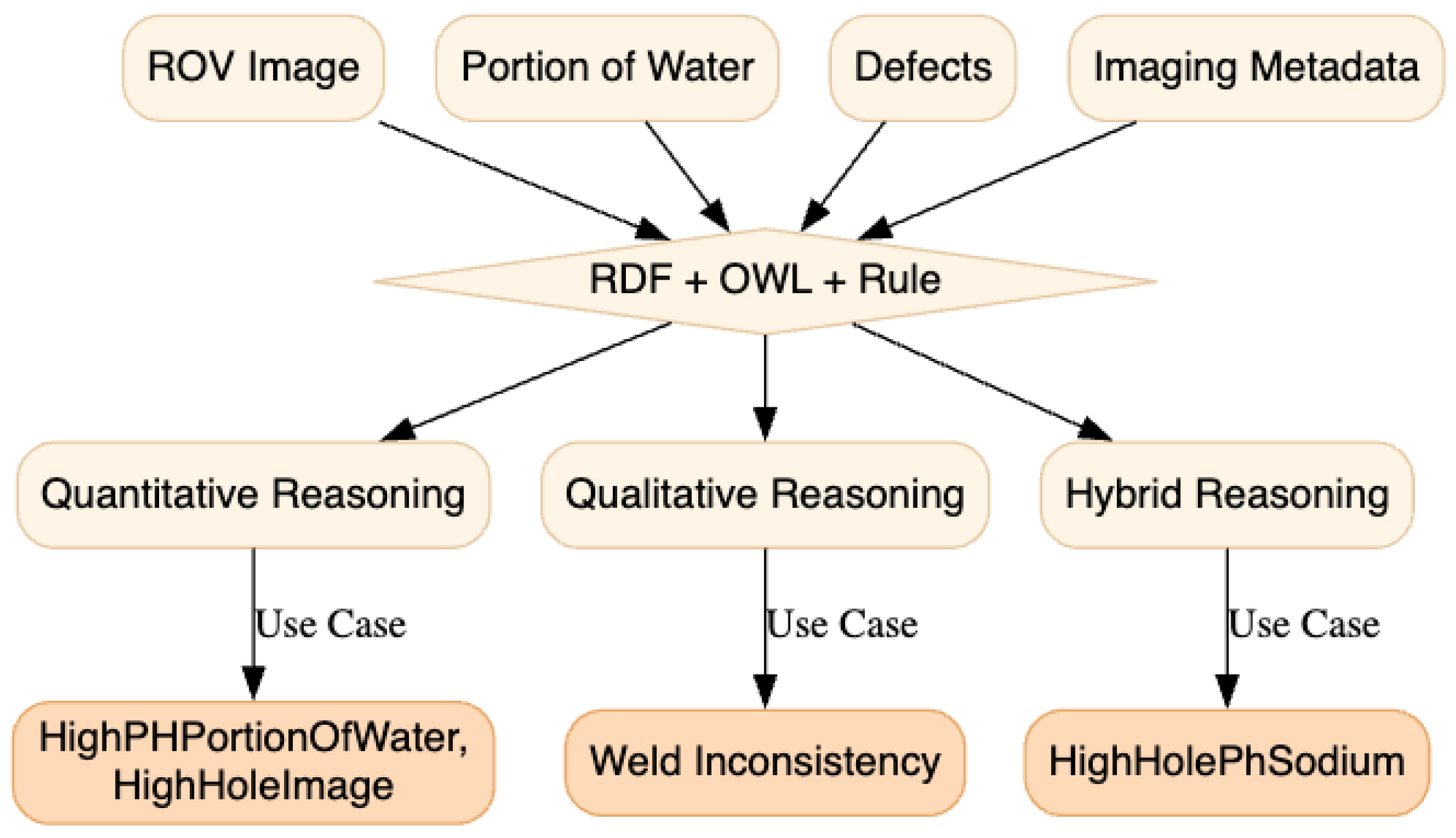 Hybrid reasoning in ROVON represents a semantic inference approach that integrates both quantitative thresholds and logical structural conditions. The system activates when numerical values and relational patterns match specified criteria, which distinguishes it from purely quantitative or qualitative methods. Through this reasoning approach, the system identifies complex environmental conditions where multiple measurement attributes and defect characteristics together suggest potential operational hazards.