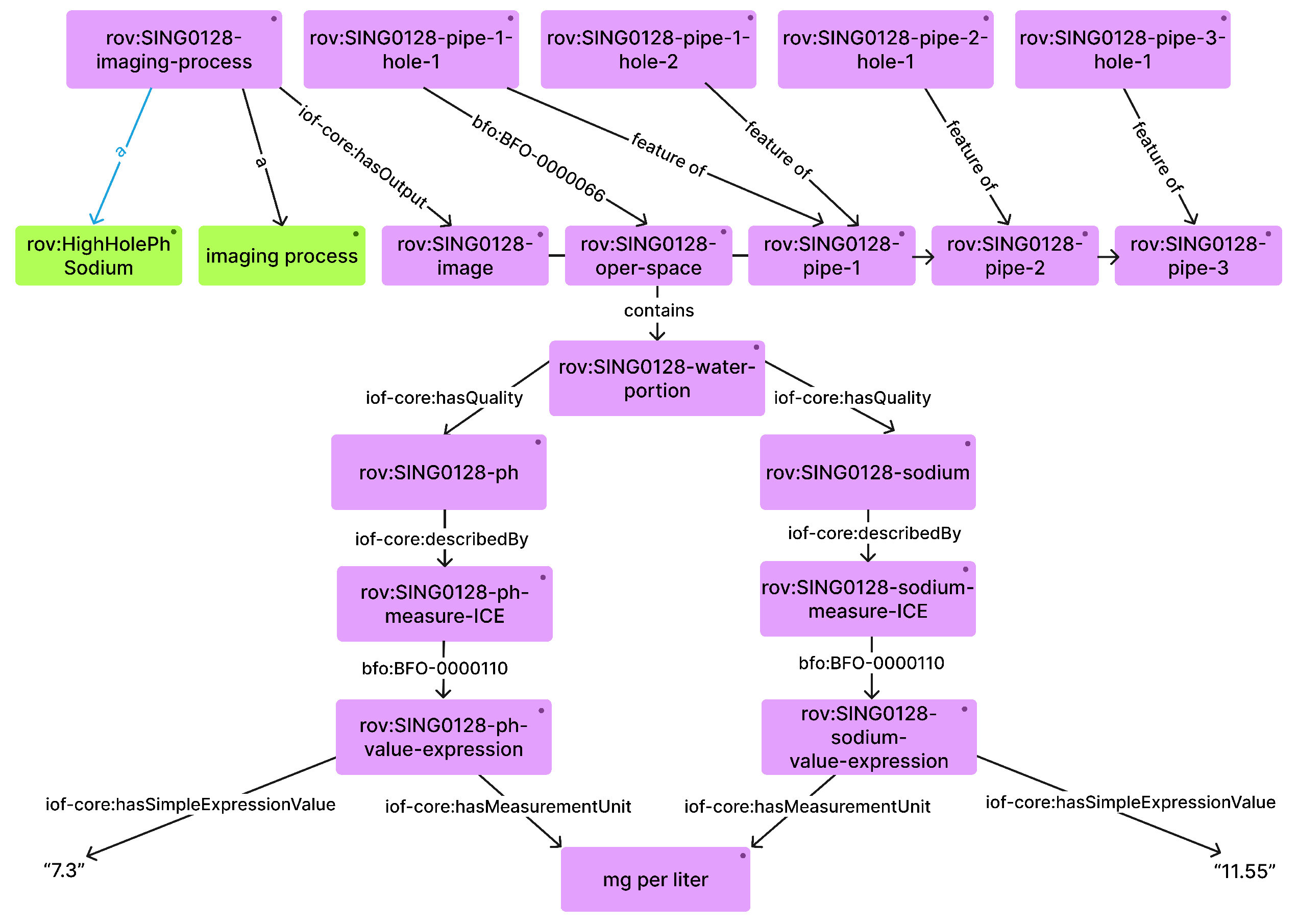 Figure 17. The rule activates through an imaging process that detects pipeline segments meeting all three of the following conditions: the presence of more than seven holes, a water sample pH greater than 7, and sodium concentrations between 12.3 and 13. The reasoning engine then assigns a new classification, rov:HighHolePhosodium, to indicate cases where chemical aggressiveness and structural vulnerability converge (see