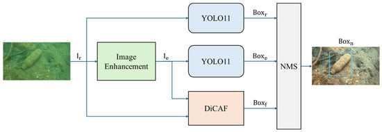 Overall architecture of the proposed underwater object detection framework. The blue box indicates the final detection result obtained by integrating , , and using NMS.