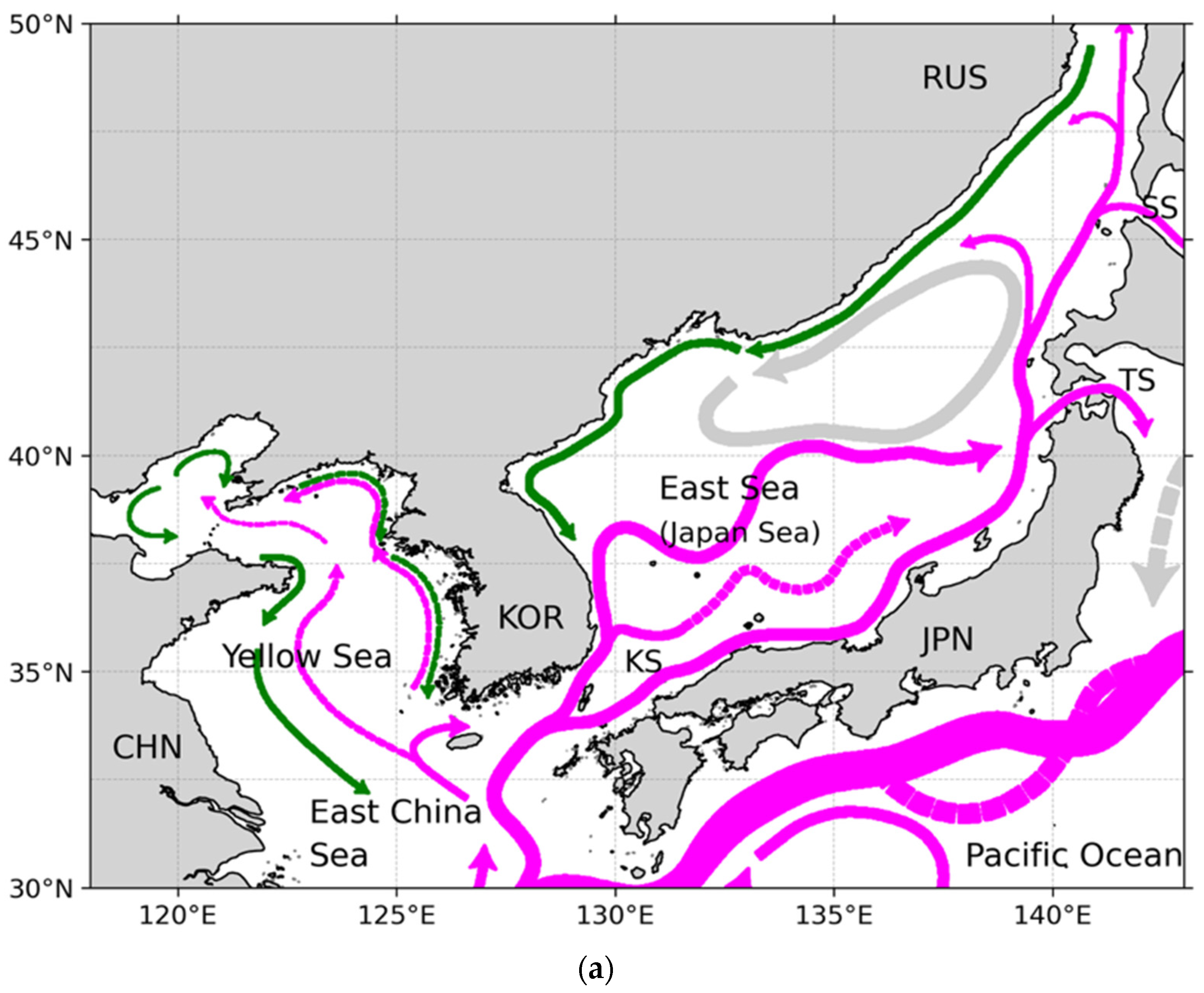 - Park, K.; Park, J.-E.; Choi, B.-J.; Byun, D.-S.; Lee, E.-I. An oceanic current map of the East Sea for science textbooks based on scientific knowledge acquired from oceanic measurements. Sea J. Korean Soc. Oceanogr. 2013, 18, 234–265. [Google Scholar] [CrossRef]