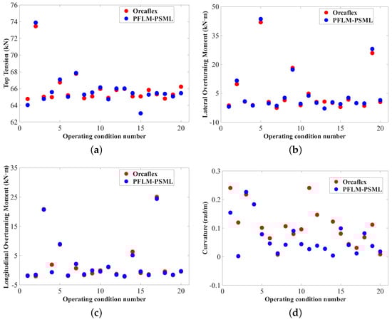 To verify the accuracy of the proposed PFLM-PSML framework, twenty sets of operating conditions were randomly generated using Python 3.12.4 (Anaconda, MT, USA), and they were input into Orcaflex and the PFLM-PSML model to calculate four output variables, respectively. The four output variables (top tension and curvature of the umbilical cable, lateral overturning moment and longitudinal overturning moment of the mining vehicle) were compared to verify the accuracy of the model. Yan [] employed LSTM to predict the top tension of the umbilical cable, in which the number of datasets was 36,000, the length of the umbilical cable was 237.5 m, and the water depth was 100 m. The total length of the umbilical cable in this paper exceeded 5500 m, the water depth exceeded 5000 m, and the number of training sample points of different PFLM-PSML models is shown in Table 2.