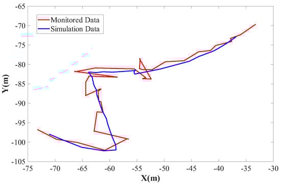 In Figure 2, a USBL beacon was installed on the umbilical cable to monitor the movement of the umbilical cable at the sensor position. As shown in Figure 8, the starting position is at the bottom left, and the ending position is at the top right. The trajectory of the USBL beacon predicted by the simulation agrees well with the trajectory monitored by the USBL beacon. When the mining vehicle is at (−57.78, −91.89) in the local coordinate system of the mining ship and the wave height is 0.41 m, the distance between the monitored position and the simulation position is the smallest, which is 0.3 m; when the mining vehicle is at (−52.87, −86.22) and the wave height is 0.46 m, the distance between the monitored position and the simulation position is the largest, which is 6.24 m. During the walking process of the mining vehicle on the seabed, the deviation is less than 4 m over the entire range of the umbilical in most cases. Therefore, the reliability and accuracy of the numerical simulation model we built are verified.