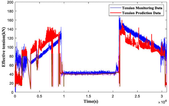 Figure 9 shows the comparison between the measured data of the top tension of the umbilical cable during sea trial mining operations and the predictions obtained using the PFLM-PSML model. The measured data indicated that during operations, the top tension of the umbilical cable exhibits distinct dynamic fluctuations, with values consistently hovering around 42 kN. This reflects the stochastic and nonlinear characteristics of the cable structure under the influence of waves, currents, and floating body motions in a deep-sea environment. In contrast, the data predicted by the PFLM-PSML model remain relatively stable at approximately 40 kN. The close alignment in the general trends between the measured and predicted data fully demonstrates the effectiveness of the GPR model in capturing the dynamic response of the umbilical cable. Based on Bayesian statistical theory and employing kernel functions to model complex nonlinear systems, the PFLM-PSML approach is capable of achieving precise fitting even when the data contain noise, thereby efficiently predicting the dynamic behavior of the cable. The excellent match between the sea trial results and the model predictions validates the feasibility of the GPR-based prediction method for practical engineering applications.
