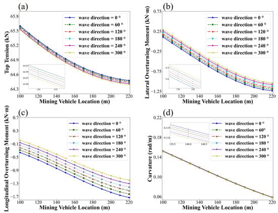 In Figure 12, the wave direction is also analyzed at intervals of 60°. The results indicate that as the wave direction angle increases, the top tension, curvature of the umbilical cable and overturning moment of the mining vehicle all increase, reaching their maximum at a wave direction angle of 0°. However, it should be pointed out that the umbilical cabe is less sensitive to wave direction.
