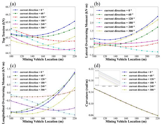 Figure 13 shows the effects of current direction on the mechanical responses. And current directions of , , , , , and are selected for analysis. The results indicate that no clear pattern is observed in the variation in physical quantities with changing current direction. When the mining vehicle is within 140 m, the top tension of the umbilical cable reaches its maximum at . However, when the mining vehicle distance exceeds 140 m, the top tension is highest at . Additionally, the lateral overturning moment of the mining vehicle is maximized at . The longitudinal overturning moment reaches its maximum at when the mining vehicle is within 168 m. In the range of 168 m to 188 m, the longitudinal overturning moment is highest at , whereas beyond 188 m, it is maximized at . Furthermore, the curvature of the umbilical cable decreases as the current direction increases.