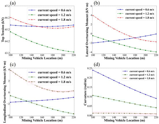 As shown in Figure 14, current velocities of 0.6 m/s, 1.2 m/s, and 1.8 m/s are selected for analysis. The results indicate that when the mining vehicle distance is less than 155 m, the top tension of the umbilical cable reaches its maximum at a current velcocity of 1.8 m/s. Conversely, when the mining vehicle distance exceeds 155 m, the top tension is highest at a current velcocity of 0.6 m/s. Regarding the lateral overturning moment of the mining vehicle, it is maximized at a current velcocity of 1.8 m/s when the mining vehicle distance is less than 180 m, whereas for distances greater than 180 m, the maximum occurs at a current velcocity of 0.6 m/s. Additionally, the longitudinal overturning moment is consistently highest at a current velcocity of 1.8 m/s. Further analysis reveals that as the current velcocity increases, the curvature of the umbilical cable decreases.