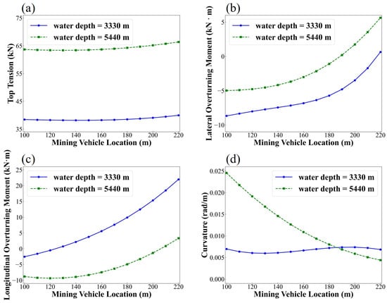 The influence of water depth was analyzed for 3330 m and 5440 m, as shown in Figure 15. With increasing depth, the top tension of the umbilical cable and the lateral overturning moment of the mining vehicle increase, while the longitudinal overturning moment of the mining vehicle decreases. As the water depth increases, the difference in the top tension of the umbilical cable is roughly equal to the wet weight of the increased umbilical cable.
