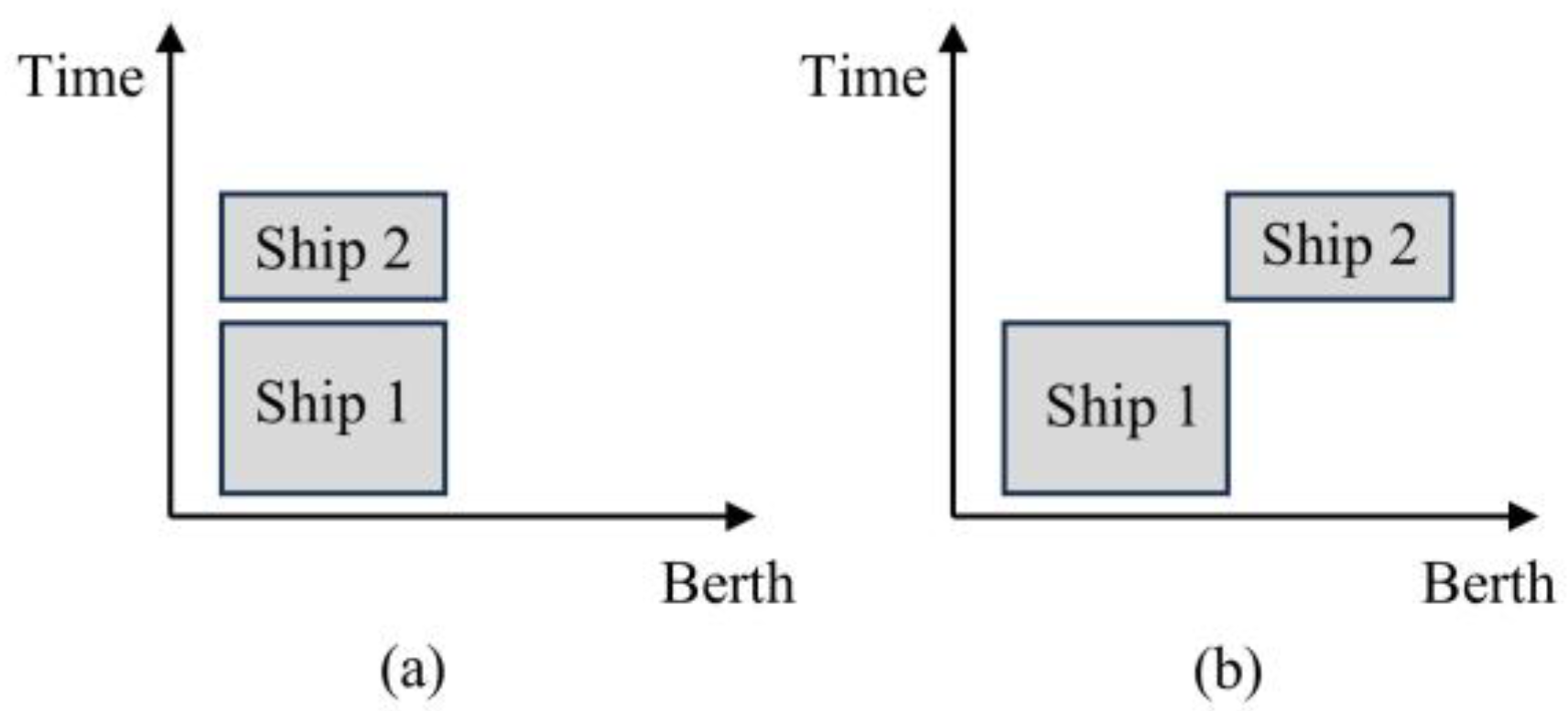 - Fan, H.; Zhang, T.-H.; Zhao, J.; Yue, L.-J. Berth Allocation and Tugboat Scheduling Problem for Tidal Ports with Compound Channels: The Case of Tianjin Port. Ocean Eng. 2025, 324, 120744. [Google Scholar] [CrossRef]