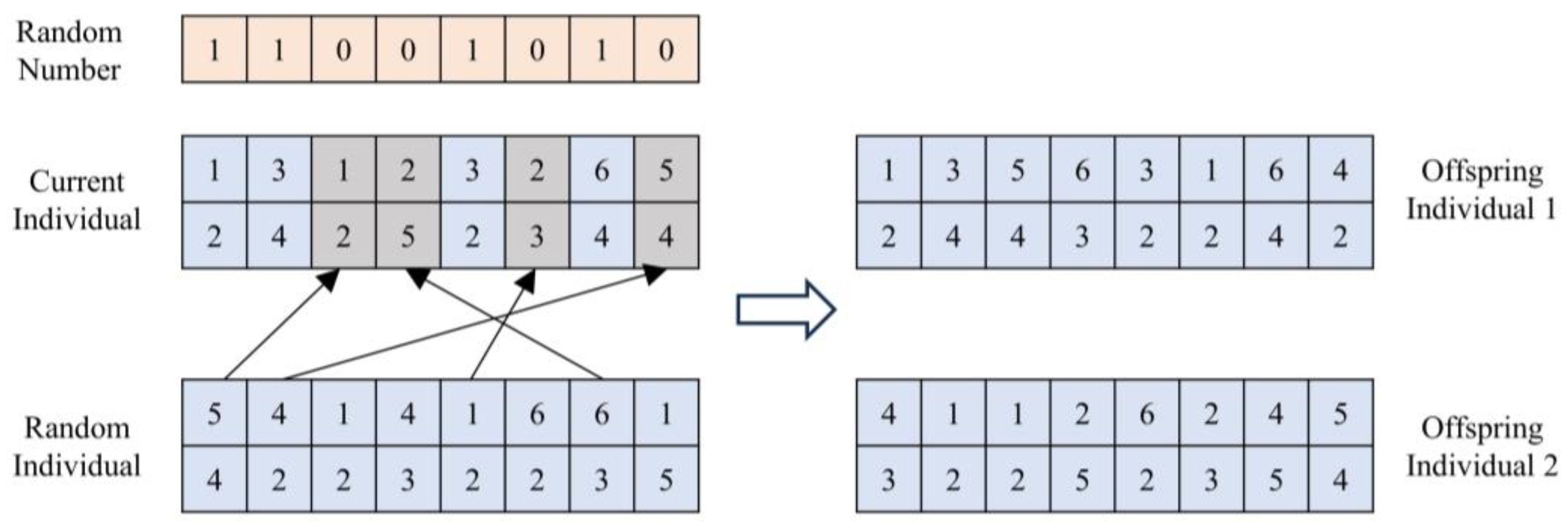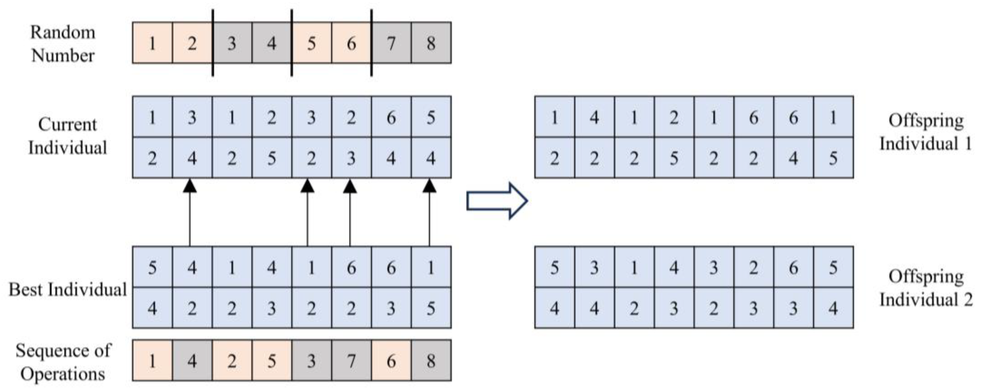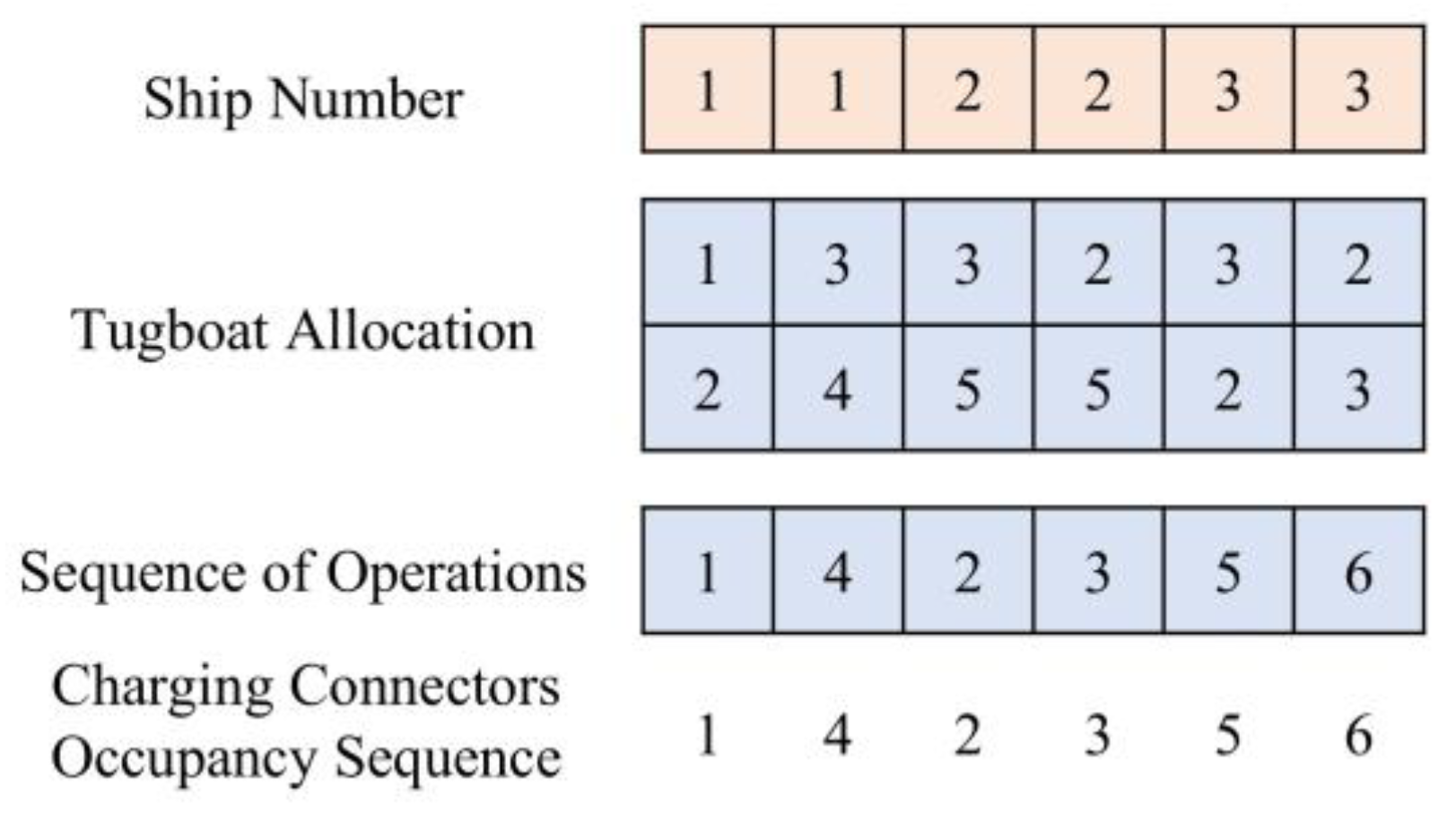 - The first rule is that tugboats with earlier task sequences are given priority to use the earliest available charging connectors. Therefore, the operation sequence encoding also determines the priority of the tugboats using the charging connectors. For example, in Figure 7, tugboats 1 and 2, which perform berthing operations for ship 1, are scheduled to charge before tugboats 3 and 5, which perform berthing operations for ship 2.