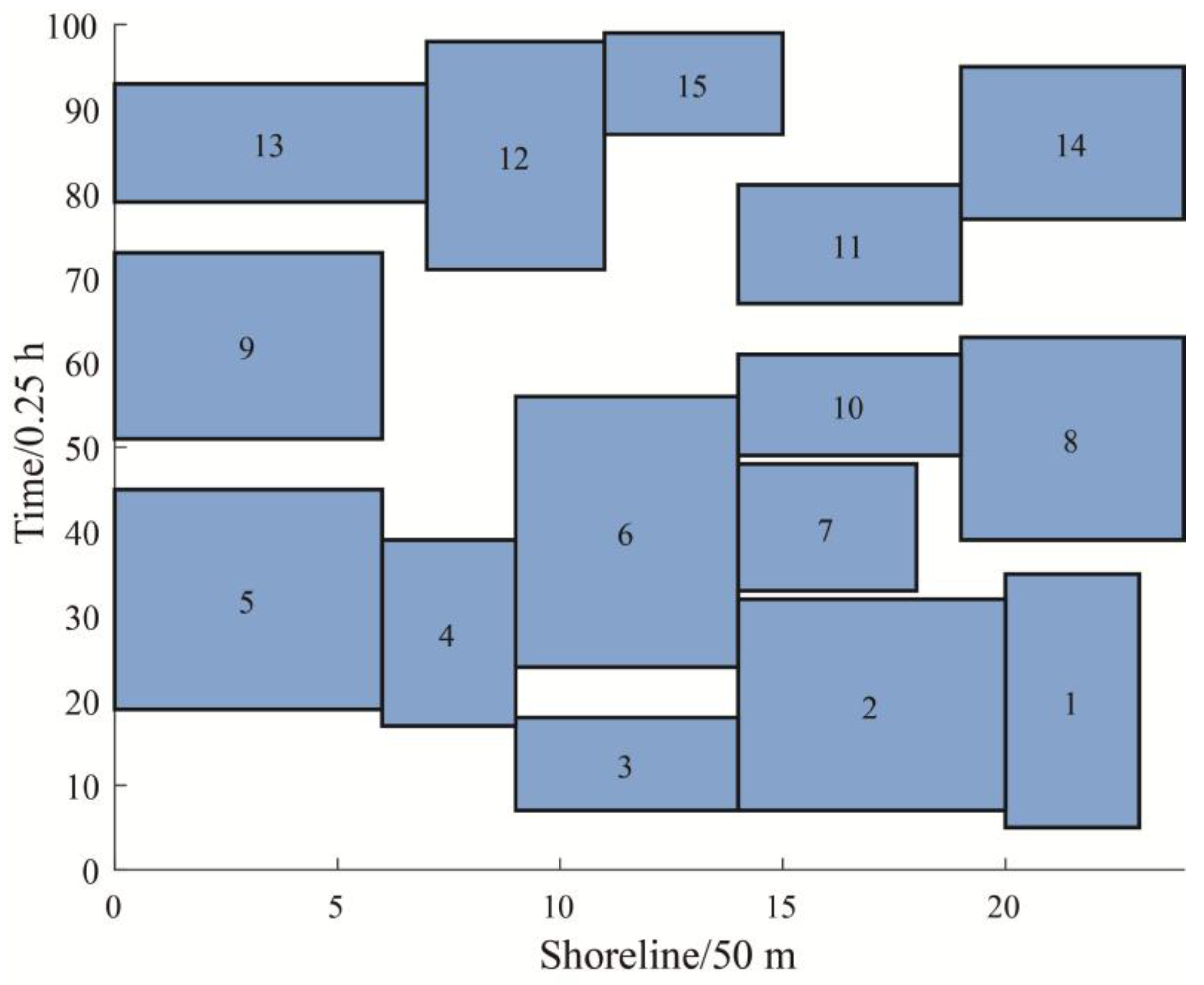 - Step 3: The task’s start time is set to the earliest time at which the assigned tugboats can provide service. If a hybrid tugboat is included among the assigned tugboats, intermittent charging may be performed before the task’s start time. If the tugboat is waiting at the anchorage and the current task is a berthing task, the tugboat will not return to the berth for charging.