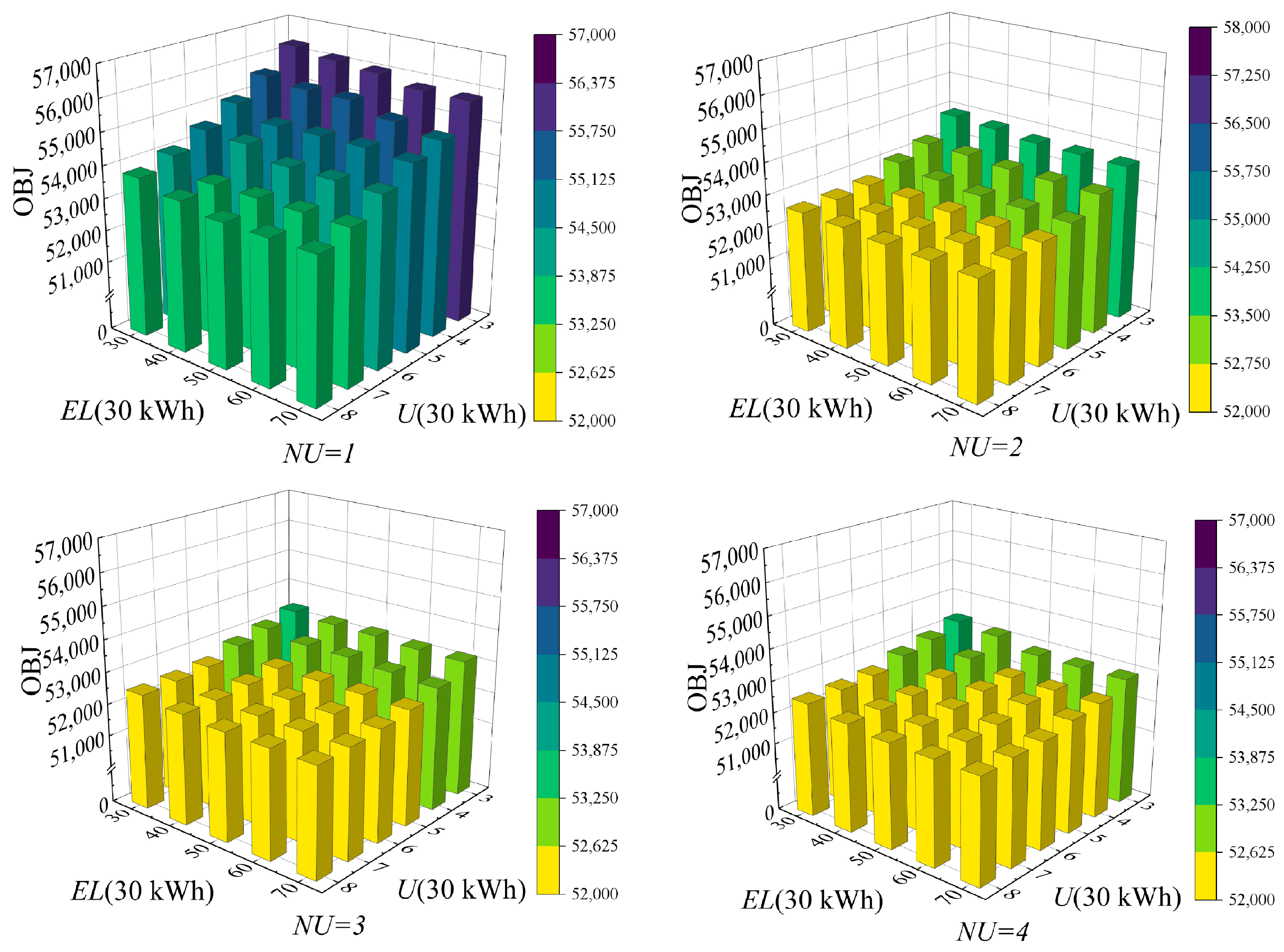 - The appropriate values for the number of charging connectors, battery capacity, and charging rate for hybrid tugboats significantly affect the total scheduling cost. When battery capacity and charging rate values are appropriately selected, configuring a number of charging connectors different from the number of hybrid tugboats can still effectively reduce the tugboat operational costs. Consequently, the port authority can reduce the number of tugboat charging facilities to a certain extent.