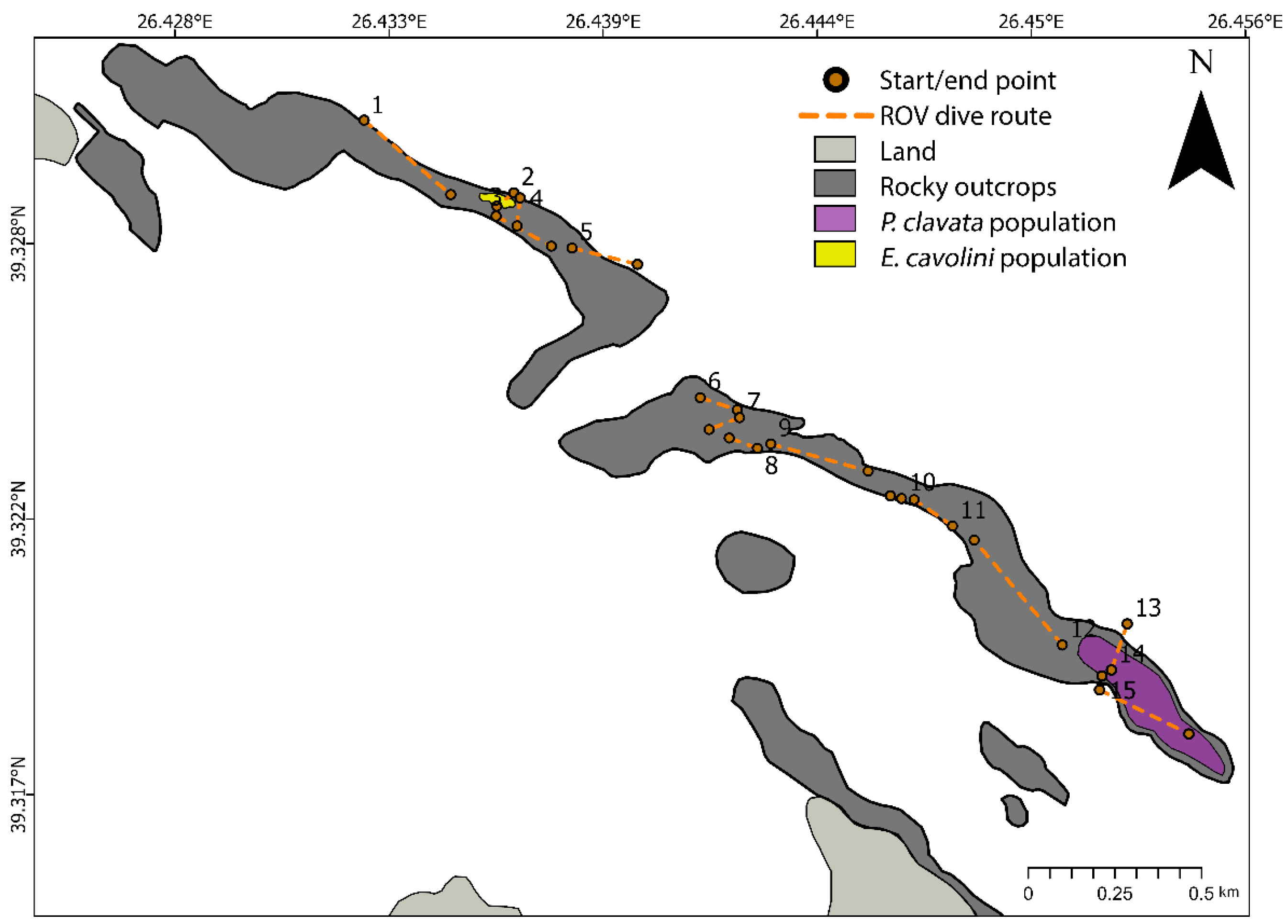 - Chimienti, G.; Maiorca, M.; Digenis, M.; Poursanidis, D. Conservation status of upper-mesophotic octocoral habitats at Sporades Archipelago (Aegean Sea). Mar. Pollut. Bull. 2023, 190, 114868. [Google Scholar] [CrossRef]