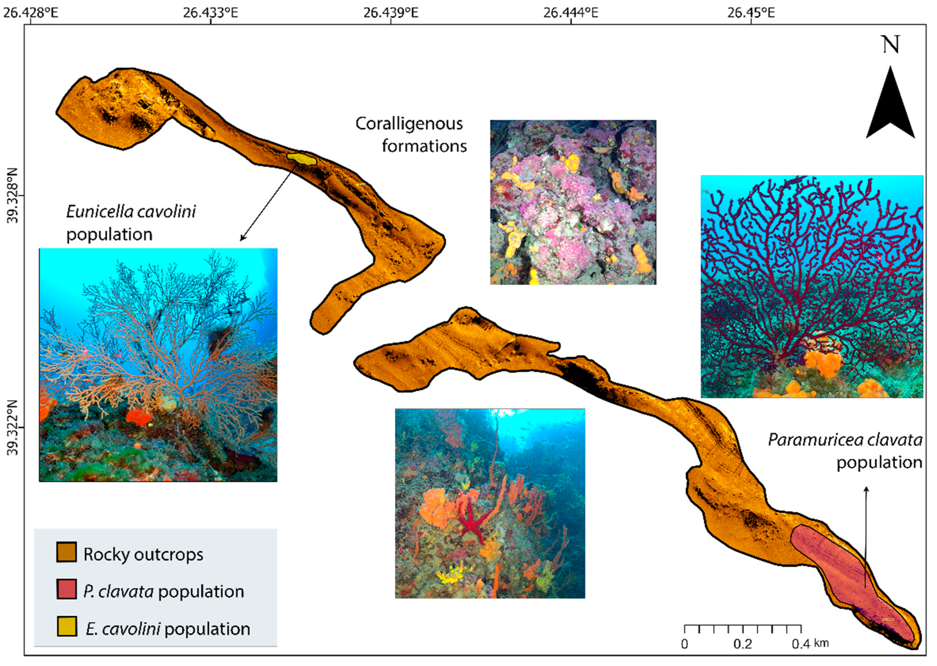 - Sini, M.; Kipson, S.; Linares, C.; Koutsoubas, D.; Garrabou, J. The yellow gorgonian Eunicella cavolini: Demography and disturbance levels across the Mediterranean Sea. PLoS ONE 2015, 10, e0126253. [Google Scholar] [CrossRef] [PubMed]