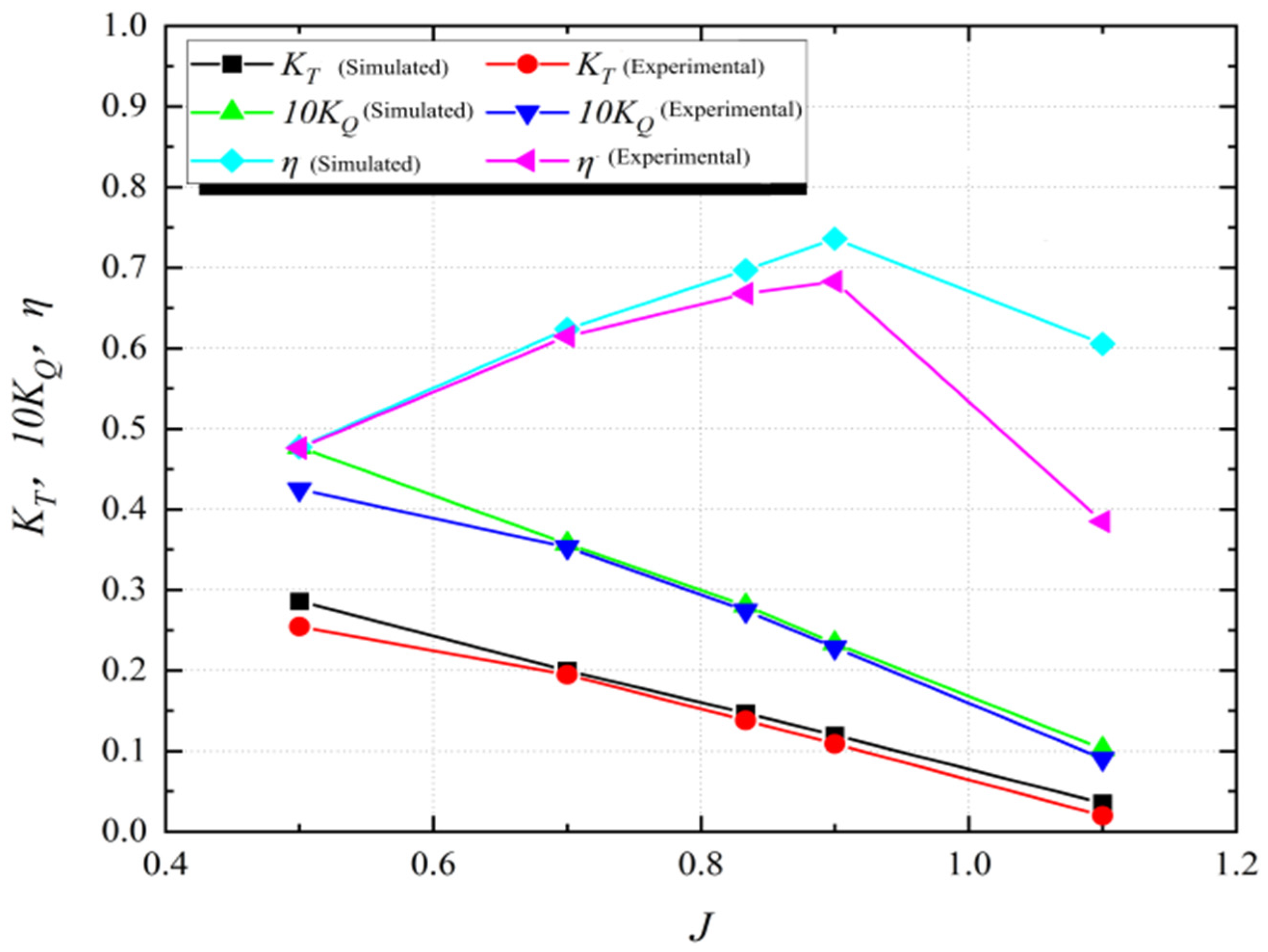 Figure 8 demonstrates that when the advance coefficient (J) is below 0.9, the experimental data and numerical results show good agreement with minor errors. However, as J exceeds 0.9, the discrepancy gradually increases due to the significantly enhanced complexity of the flow field under high advance speed conditions. This deviation can be attributed to two main factors: first, the increasing flow separation and enhanced turbulence and vortex dissipation effects under high J conditions, which present challenges for numerical simulations in resolving such transient flow features [