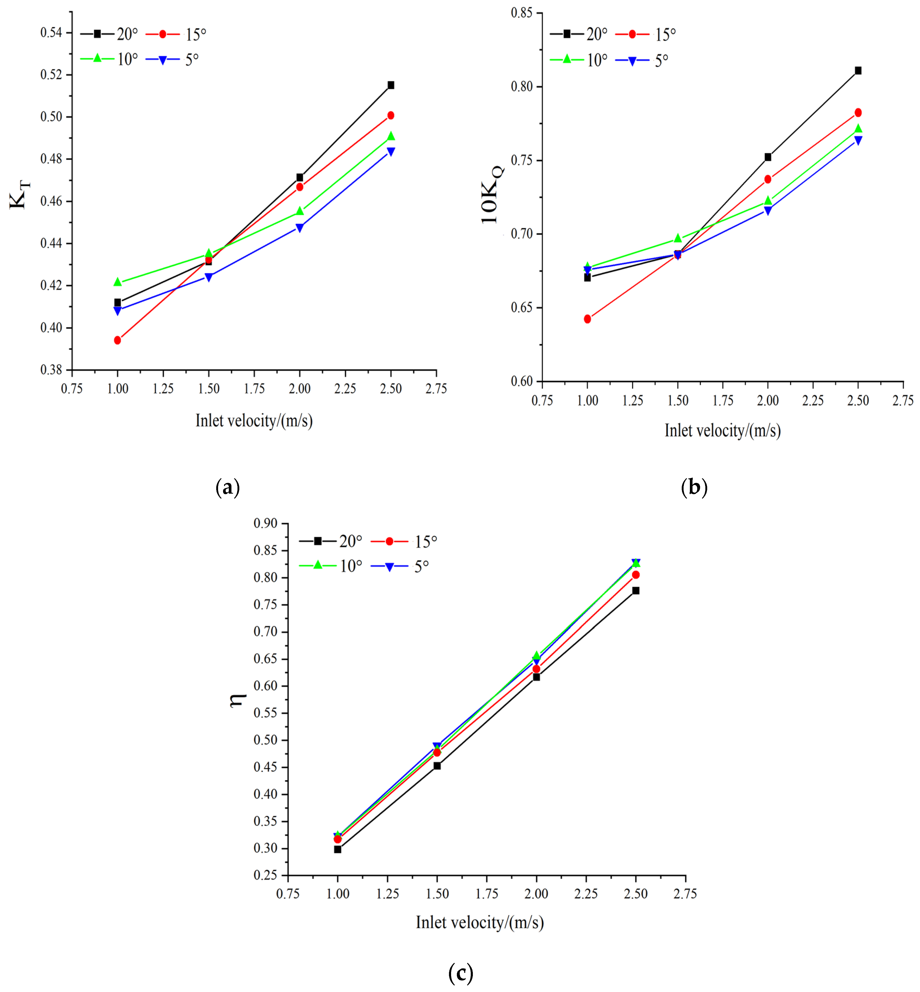 Figure 9b, the variation pattern of the torque coefficient is basically similar to that of the thrust coefficient. After the inlet velocity exceeds 1.8 m/s, the torque coefficient at the same inlet velocity also increases with the increase in the inclination angle. This is because the change in the propeller blade angle causes the angle of contact between the water flow and the blades to increase, generating a larger lateral force and moment. At the same time, the increase in the inclination angle makes the flow field asymmetrical, which is consistent with the conclusion analyzed in