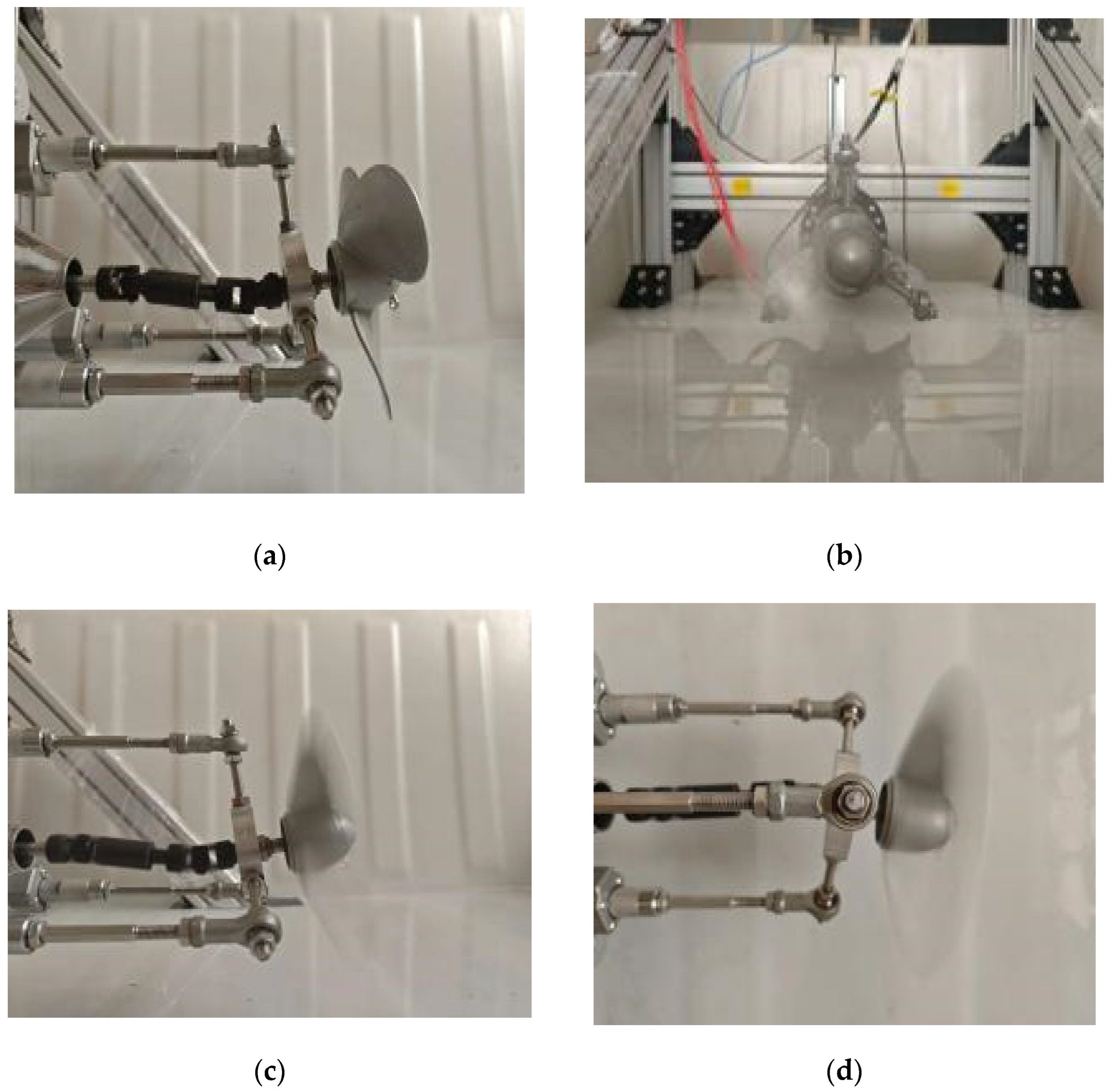 Figure 11, which details the working process: (a) stationary state; (b) motion state; (c) propeller uptilt state; and (d) propeller downtilt state. It should be noted that the experimental setup employs a specific propeller type and a steering mechanism whose parameters are determined by a static stiffness model. While this specific configuration is the focus of the present study, the design of the test bench and the methodological approach are sufficiently general to accommodate future investigations of other propeller-mechanism combinations.