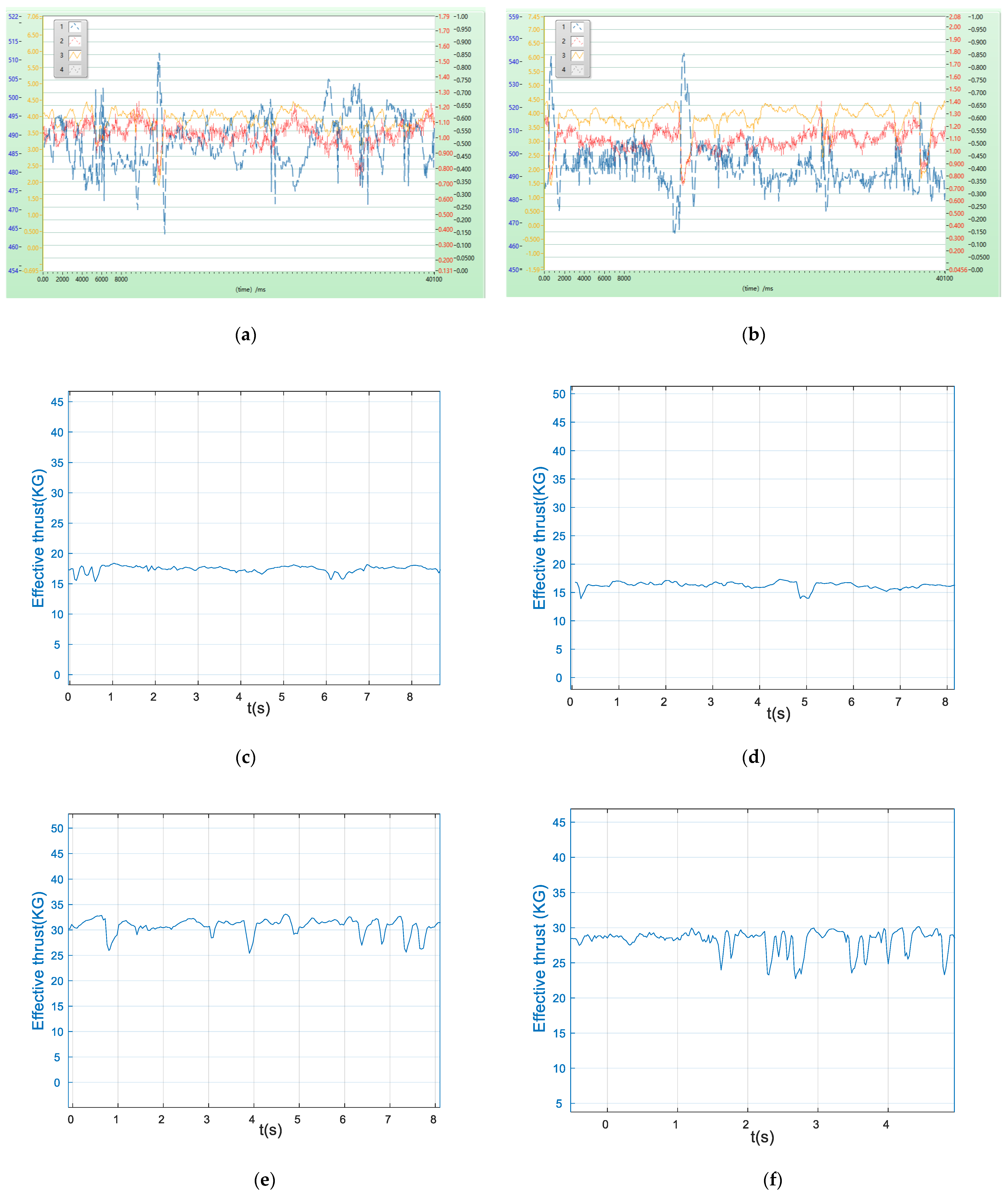 Figure 12b, respectively. Spectral analysis of the corresponding raw signals indicates a highly complex frequency structure, which is attributed to nonlinear vibrations induced by the coupled steering mechanism. This spectral complexity makes it difficult to clearly identify the dominant blade-passing frequency, necessitating dedicated data processing for specific operational parameters. Therefore, to systematically characterize the performance of the vector thruster, the acquired data were processed and analyzed under four distinct parameter combinations. The resulting dynamic characteristic curves are presented in