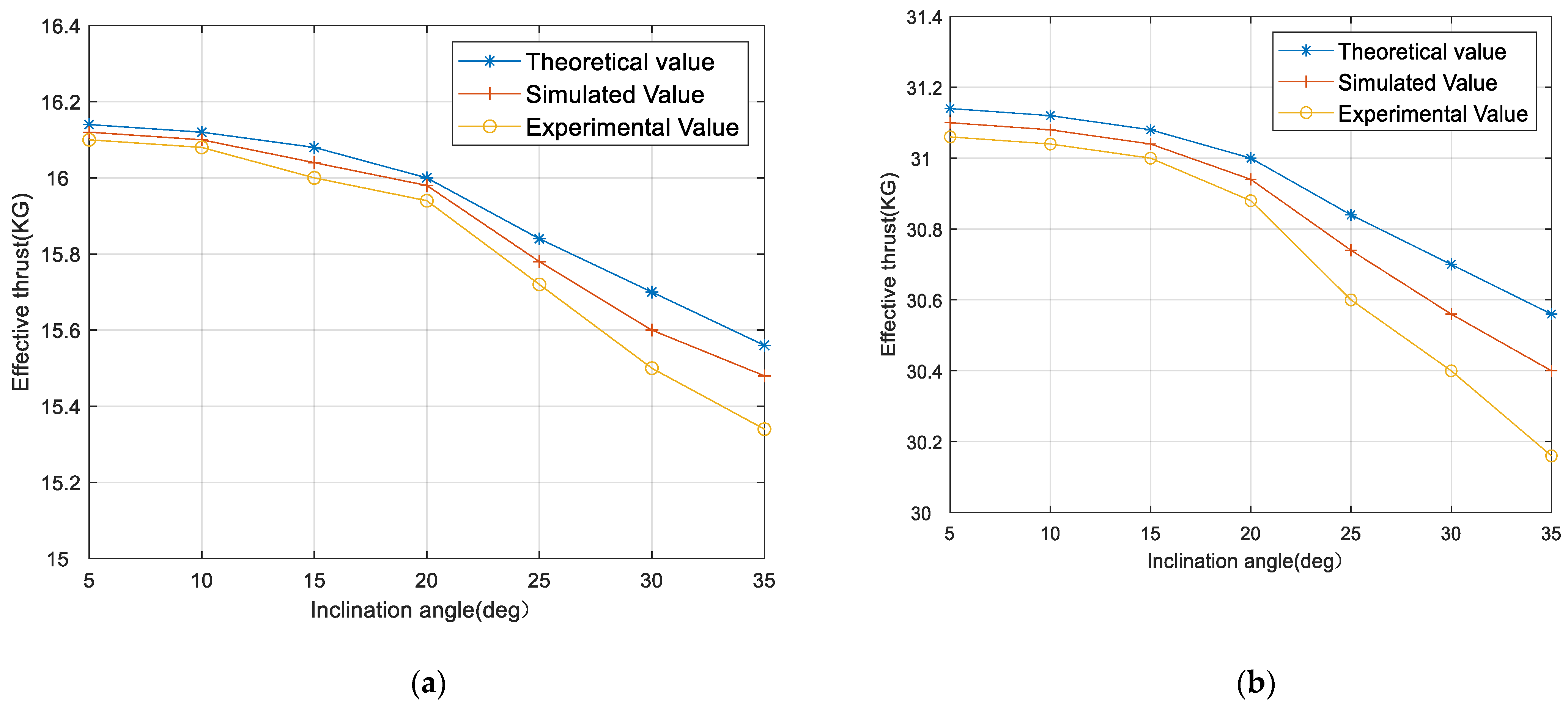 Figure 12f, it can be found that the mean thrust decreases as the inclination angle increases. That is, the thrust loss becomes more pronounced. To reveal the characteristics of the thrust loss, we plotted the variation in the theoretical value, simulated value, and measured values with the inclination angle at different speeds, as shown in