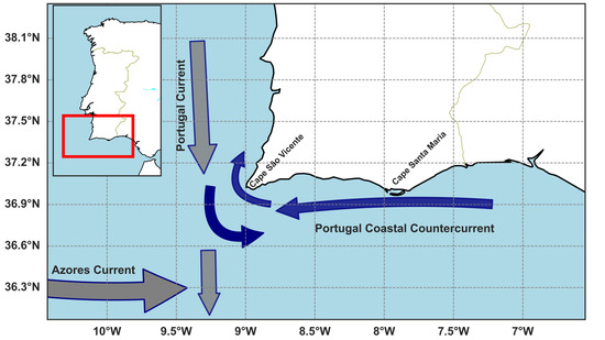 The region is, furthermore, a part of the Canary Current Upwelling System (CCUS), which extends from 43° N to 10° N along the west coast of Iberia to the northwest coast of Africa. Upwelling off the west coast of Portugal occurs in spring and summer, when surface water along the coastline is transported offshore due to the combined effects of the northeasterly winds and the Coriolis force [29]. Off the southern coast of Portugal, the Portugal Coastal Countercurrent transports warm surface water westward in winter [31]. Once these waters reach the furthest western point along the south coast of Portugal at Cape São Vicente, they occasionally rotate clockwise and are further transported northward along the west coast [31]. The northward transportation of surface water along the west coast produces downwelling events [30].