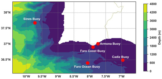 The five buoys within the computational grid of Figure 2 were used to compare model results with in situ observations. These buoys are equipped with high-precision sensors that accurately represent wave parameters, such as the significant wave height, mean wave direction, and peak period. Wave data at the Faro Ocean Buoy, Cadiz Buoy, and Sines Buoy were obtained from the CMEMS In Situ Thematic Assembly Center (In Situ TAC) product Global Ocean In Situ Near-Real-Time Observations [52]. Wave data provided by CMEMS In Situ TAC is quality controlled, and only good data are made publicly available. Therefore, only quality controlled data have been used to validate the model results. For a complete description of the validation and quality control of these data, refer to the CMEMS In Situ TAC Quality Control document for waves [53]. Measurements from the Faro Ocean Buoy and Sines Buoy are provided by Instituto Hidrográfico (IH), whereas measurements from the Cadiz Buoy are provided by Puertos del Estado. Data from the two buoys closer to shore (the Faro Coast and Armona Buoys) only contain data for the year 2023. The 2023 dataset at the Faro Coast Buoy was purchased from IH, and the Armona Buoy dataset was provided by CIMA at the University of Algarve. The buoy locations and their depths are described in Table 1.