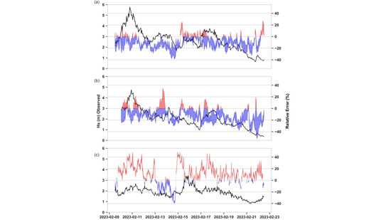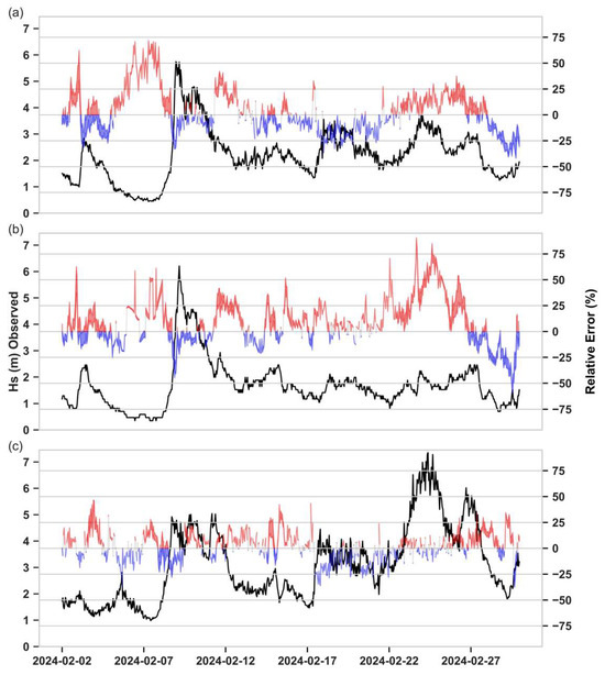 Time series of Hs at the (a) Faro Ocean, (b) Cadiz, and (c) Sines buoys to assess differences in error during the model calibration period. Black lines show buoy observations (left axis), and shaded areas indicate the range of the relative error across the seven model runs (Table 4), with overpredictions in red and underpredictions in blue.