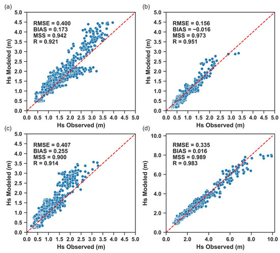 Scatter plots showing the RMSE, BIAS, MSS, and R (Pearson’s Correlation Coefficient) values between observations and modeled Hs at the (a) Faro Ocean Buoy, (b) Faro Coast Buoy, (c) Cadiz Buoy, and (d) Sines Buoy during the validation period of November 2023.