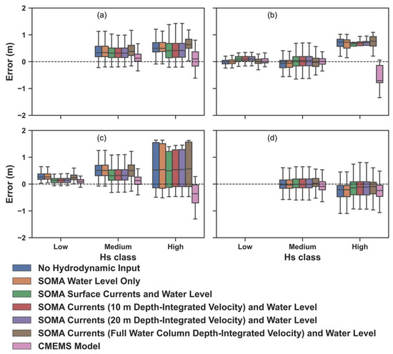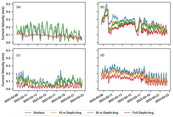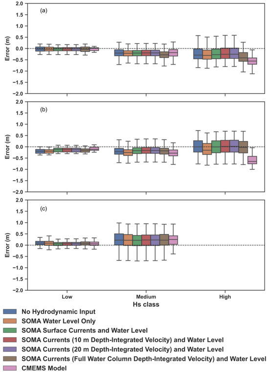 To complete this assessment, various outputs from SOMA were used to test the model sensitivity to hydrodynamic forcing. The calibrated and validated standalone SWAN setup without any current velocity or water level forcing from SOMA was used as the control run (Run 1). To test the hydrodynamic influence on wave propagation in the region, several simulations were run with different forcing outputs from SOMA, as indicated in Table 4. The rationale for forcing the wave model with the current velocity from the surface (Run 3), upper 10 m (Run 4), and upper 20 m (Run 5) of the water column is that wave-induced velocities, i.e., orbital velocities, are more significant near the surface and decay exponentially with depth [60]. Therefore, to properly simulate wave propagation, it is important to have an appropriate characterization of the ambient currents at the surface or near the surface. In contrast, the depth-averaged velocity for the entire water column (Run 6), which is used in many wave model applications, is expected to have the least influence on wave propagation, so including this current field in the hydrodynamic forcing experiments allows for a complete assessment of how currents from different depths affect wave propagation. All the outputs from SOMA that were used as initial conditions for the wave model during these experiments were time and space varying, covering the same spatial grid and timeframe of each simulation.