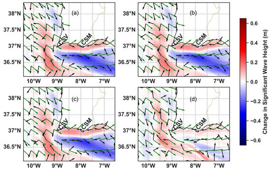 Changes in Hs due to the combination of the wave–current angle difference and surface current velocity magnitude during the E-SE storm due to (a) the surface current velocity and water level forcing, (b) 10 m depth-averaged current velocity and water level forcing, (c) 20 m depth-averaged current velocity and water level forcing, and (d) depth-averaged current velocity from the entire water column and water level forcing.