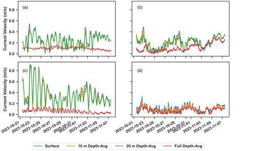To compute the depth-averaged velocity for the first 10 m, first 20 m, and the entire water column, the depth-integrated velocities of both the eastward and northward velocity components were computed. As SOMA consists of 50 vertical Cartesian coordinate layers with varying thicknesses for each layer, with cell thickness increasing toward the bottom, it was imperative to compute depth-weighted velocities as opposed to a simple mean. The depth of each layer corresponds to the depth of the bottom of each cell, and the cell thickness corresponds to the distance (m) between the top and bottom of that cell. In this configuration, layer 6 corresponds to a depth of approximately 10 m. To obtain the depth-averaged velocity of these 6 upper layers, the values for both the eastward and northward velocity components were selected and then multiplied by the cell thickness. This result was then summed and divided by the total thickness of these vertical layers, resulting in a 2D array for each eastward () and northward () velocity component. The same method was applied to compute depth-averaged velocity up to 20 m, except in this case, it was applied up to layer 11 in the SOMA grid. To compute the depth-averaged velocity for the entire water column, all 50 vertical Cartesian coordinate layers of the SOMA grid were included.