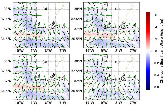 Changes in Hs due to the combination of the wave–current angle difference and surface current velocity magnitude during the W-SW storm due to (a) the surface current velocity and water level forcing, (b) 10 m depth-averaged current velocity and water level forcing, (c) 20 m depth-averaged current velocity and water level forcing, and (d) depth-averaged current velocity from the entire water column and water level forcing.