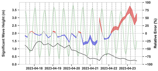 To assess the influences of the various hydrodynamic inputs on wave propagation during a storm with predominantly W-SW waves, a time series of the significant wave height is exhibited in Figure 5. Buoy observations are shown on the left axis, while the range in the relative error between all the modeled results (run IDs from Table 4) and buoy observations are plotted on the right. This allows for an analysis of model’s ability to accurately capture wave propagation throughout the simulation and to assess the variability between the model runs that implemented various hydrodynamic forcings.