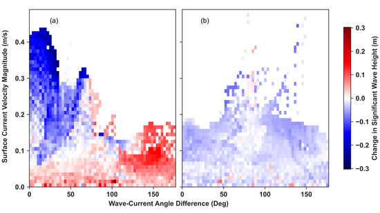 The effects of wave–current interactions were analyzed by computing the differences in the angle between the mean wave direction and mean current velocity direction for each storm, using the average values over the simulation period. A wave–current angle absolute difference of 30° or less implies a following current, whereas a wave–current angle difference of 150–180° implies an opposing current. The current velocity magnitude was binned into 1 m/s bins, and the differences between current and wave angles were binned into 3-degree bins over the entire spatial domain. This was performed for each storm as well as for the runs incorporating current velocities from different depths in the water column.