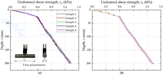 T-bar tests were conducted to determine the undrained shear strength of the prepared samples and to assess the uniformity among the five samples. The undrained shear strength (su) of the transparent soil was measured using a miniature T-bar penetrometer (length Lt = 65 mm; diameter D = 13 mm). All T-bar tests were conducted to a penetration depth of 200 mm at a constant rate (vₜ = 0.3 mm/s), corresponding to a dimensionless velocity V = vₜ D/cᵥ ≈ 1617, which exceeds 30 and thus satisfies the criterion for undrained conditions []. The coefficient of consolidation (cv) of the transparent soil was 0.076 m2/yr, as determined from one-dimensional consolidation tests conducted in accordance with ASTM D2435/D2435M-11 (2020) []. The undrained shear strength (su), calculated using a T-bar factor (Nt-bar) of 10.5 [], is plotted against depth (z) in Figure 2a, based on the results of five replicate tests. The average undrained shear strength and the corresponding standard deviation at each depth are presented in Figure 2b. The standard deviation ranged from 0.84% to 2.41%, with an overall mean of approximately 1.38%, confirming the excellent repeatability of the prepared samples.