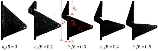 Figure 3 shows the SEPLA model anchors used in the transparent soil tests. Each model anchor was fabricated at a 1:100 geometric scale, with a total breadth (B, including the fluke and flaps) and length (L) of 40 mm, and thickness (t) of 2 mm. The padeye was designed with a diameter of 2 mm and positioned at a normal distance en = 25 mm and a tangential distance ep = 7.5 mm from the centroid of the plate, representing the padeye eccentricity and offset, respectively. Four anchors were equipped with keying flaps capable of rotating inward by up to 20° toward the shank, while outward rotation was mechanically constrained. The flap lengths (hp) were set to 0.2B (8 mm), 0.3B (12 mm), 0.4B (16 mm), and 0.5B (20 mm). A plate anchor without keying flaps (hp/B = 0) was used as a reference. All anchors were designed with the same total projected area, ensuring that the differences in performance resulted solely from flap geometry rather than plate size. Each model was 3D-printed using an aluminum alloy with a density of 2700 kg/m3. The anchor cable was made of 1.5-mm-diameter stainless steel wire with a length of 400 mm.