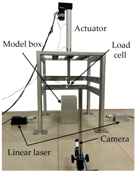 The experimental setup for SEPLA keying tests in transparent soil consisted of a model box, an actuator, a load cell, a camera, and two linear lasers, as illustrated in Figure 4. The model box was constructed from 8 mm-thick transparent plexiglass panels, allowing clear observation of anchor kinematics and the associated failure mechanisms, with internal dimensions of 280 mm × 200 mm × 350 mm (length × width × height). The actuator (DLP65E, Suzhou Dolepu Automation Equipment Co., Ltd., Kunshan, China), used to pull the anchors, was capable of operating at velocities ranging from 0.01 mm/s to 5 mm/s and applying a maximum load of 5 kN. A load cell (DYLY-109, Bengbu Dayang Sensing System Engineering Co., Ltd., Bengbu, China) with a capacity of 50 N and an accuracy of 0.01 N was used to measure the tensile load during keying. A CCD camera (Manta G-505B, Allied Vision Technologies GmbH, Stadtroda, Germany) with a resolution of 2452 × 2056 pixels and a maximum frame rate of 15 fps was used to capture image sequences during testing. Two linear lasers (GL-N-532, Changchun New Industries Optoelectronics Technology Co., Ltd., Changchun, China) with a beam thickness of 1 mm and a wavelength of 532 nm were used to illuminate the tracer particles, producing a distinct speckle pattern in the transparent soil for PIV analysis.