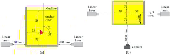 All tests were conducted in a darkroom to obtain a clear speckle field. As shown in Figure 5, two linear lasers were positioned 800 mm from the side of the model box and aligned horizontally to generate a 1 mm-thick laser sheet illuminating a vertical plane within the transparent soil. A CCD camera was placed 1000 mm in front of the model box, with its optical axis perpendicular to the laser-illuminated plane. Focus and exposure settings were adjusted prior to testing to ensure image clarity. The CCD camera captured image sequences at an average frame rate of 5 fps. The tensile load data were recorded at a sampling frequency of 5 Hz, synchronized with the image acquisition. The anchor pullout angle (θₐ) was set to 90°, and the pulling velocity (v) was maintained at 0.3 mm/s. This corresponded to a dimensionless velocity V = vB/cv ≈ 4979, ensuring undrained conditions during testing [].