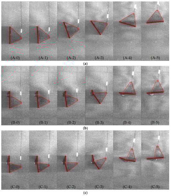 Experimental images showing the SEPLA keying process in transparent soil for anchors with varying flap lengths: (a) hp/B = 0; (b) hp/B = 0.2; (c) hp/B = 0.4.