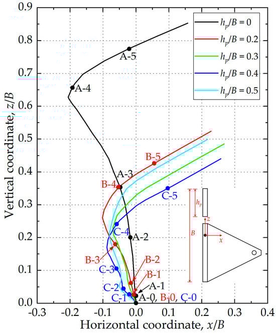 Based on the observed keying process, the trajectories of the anchor centroid were further analyzed to quantify and characterize the overall anchor movement. Figure 7 illustrates the centroid trajectories of five anchor models during keying. The initial centroid position of each anchor was set as the origin of the normalized coordinate system (x/B, z/B), where the x-axis is directed toward the shank and the z-axis is taken as positive upward. The phase points presented in Figure 6 are also marked along the centroid trajectories in Figure 7 for clarity.